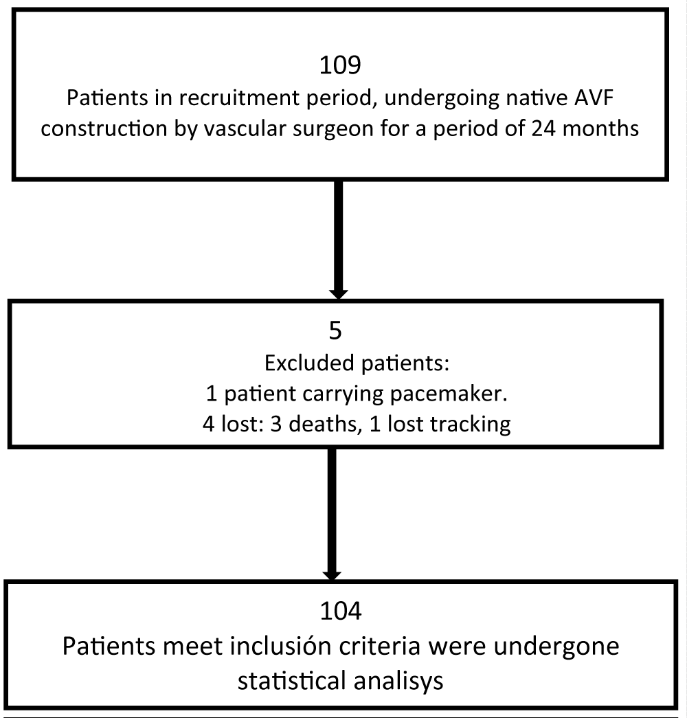 最初,从一个哥伦比亚的109名患者透析中心受到本地最喜欢建筑的自由裁量权透析中心的血管外科医生招募,近端和远端瘘管都包括de随访期间和符合入选标准。五个病人的信息是不包括在最终的分析中,一个病人携带起搏器不允许可靠的生物阻抗数据,四个丢失,3心血管死亡和失去跟踪。最后,104名患者包括相应的统计分析。不可能比较坚固组织迄今为止没有一个黄金标准参考测试血管访问故障检测术前阶段(图2)。
